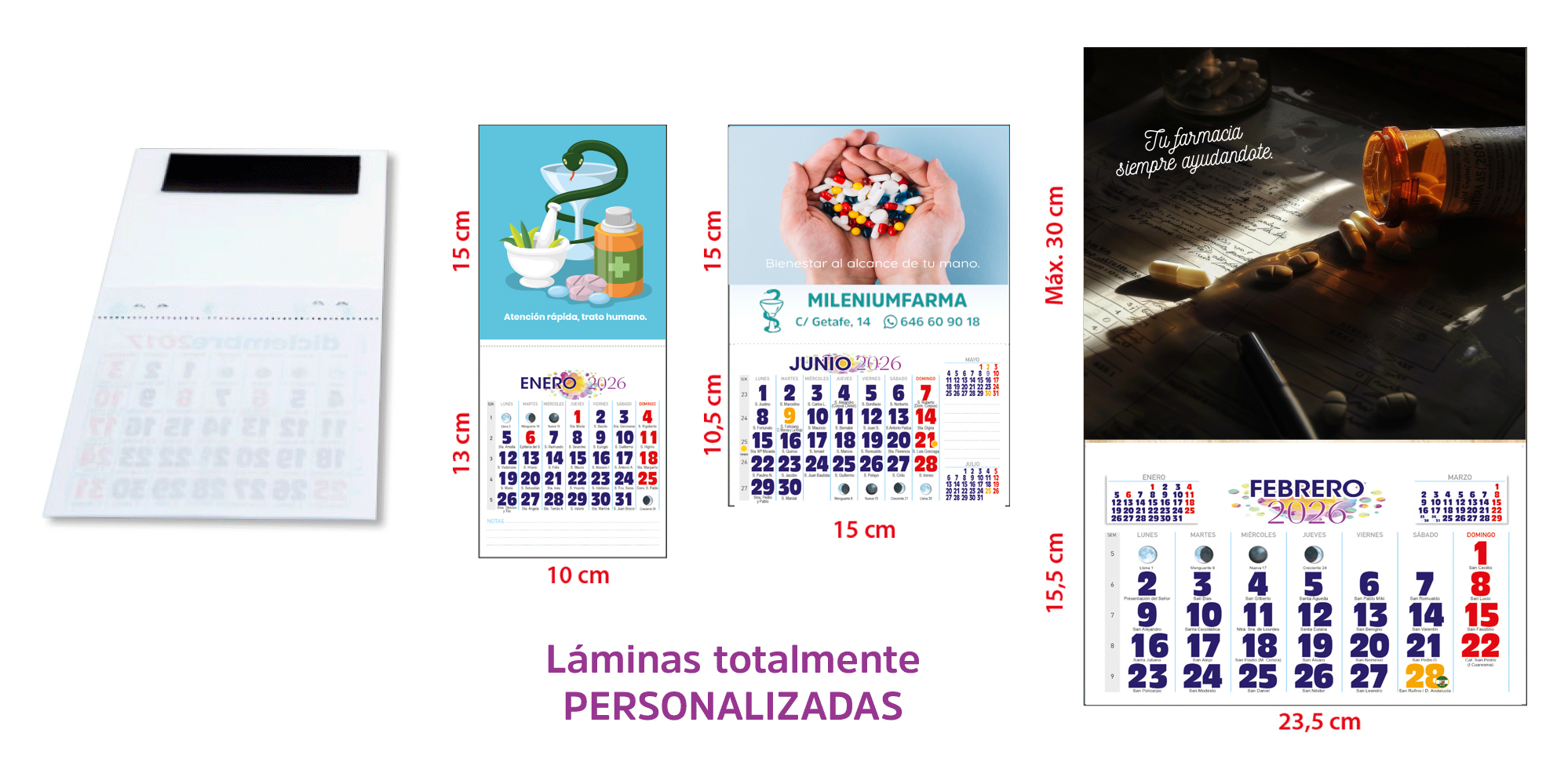 Detalles del producto: Calendarios de imán. Incluye lámina personalizada en papel estucado de 350gr., faldilla mensual con notas grapada, agujero en la parte superior para permitir colgar el calendario e imán en la parte posterior para su colocación en superficies metálicas. Disponible en 3 tamaños de anchura: |