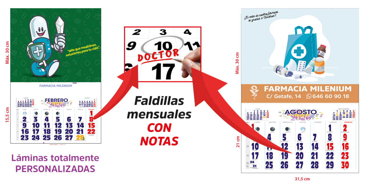 Detalles del producto: Calendarios de pared. Incluye lámina personalizada en papel estucado de 170gr., faldilla mensual con notas grapada y varilla en la parte superior para permitir colgar el calendario en la pared. Disponible en 2 tamaños de anchura: |